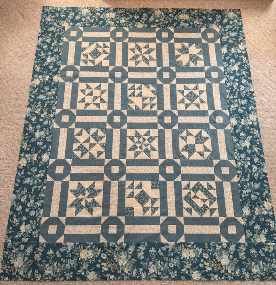 The featured quilt is 67” by 82” with the twelve blocks and a fun setting. You can also make an 82” by 97” quilt with 20 blocks. You will receive both setting instructions in month 2.