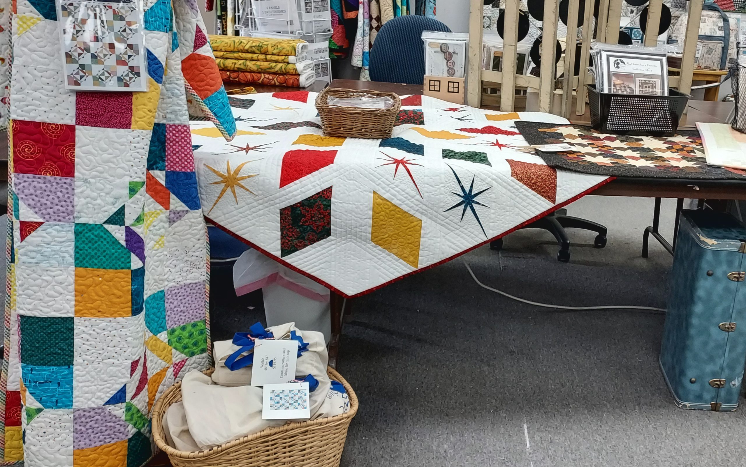 This kit includes pattern, binding, and enough bright colors (reds, greens, blues, and golds) for either size tree skirt. Background is not included. You will need 2 yds (for the 46″) or 3-1/2 yds (for the 60″)
