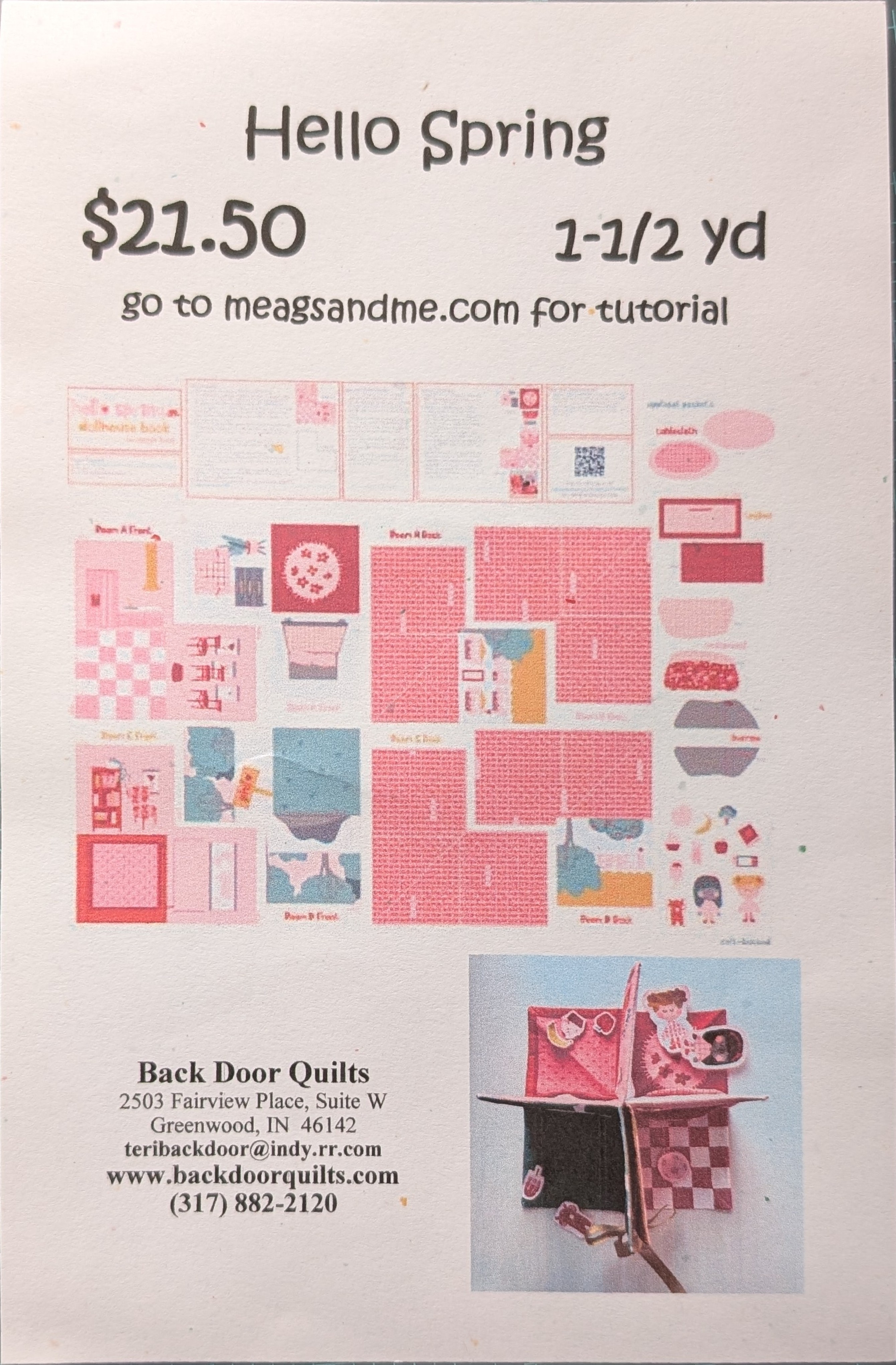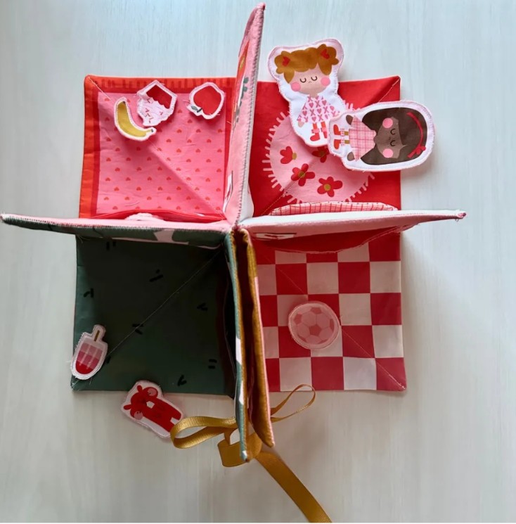 This Fabric dollhouse folds up like a book for on-the-go play. The dollhouse features a Kitchen/dining room with a tablecloth appliqued pocket, a living room with a toy box appliqued pocket, a bedroom with a bedspread appliqued pocket, and a garden with a burrow appliqued pocket. The Hello Spring dollhouse is truly playable with two dolls, a little animal friend, and lots of household objects.