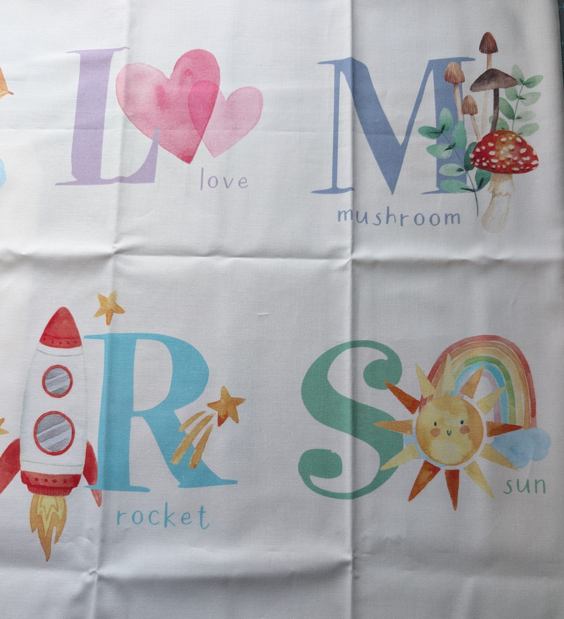 This alphabetical baby panel comes in two colorways (see blue in separate listing)