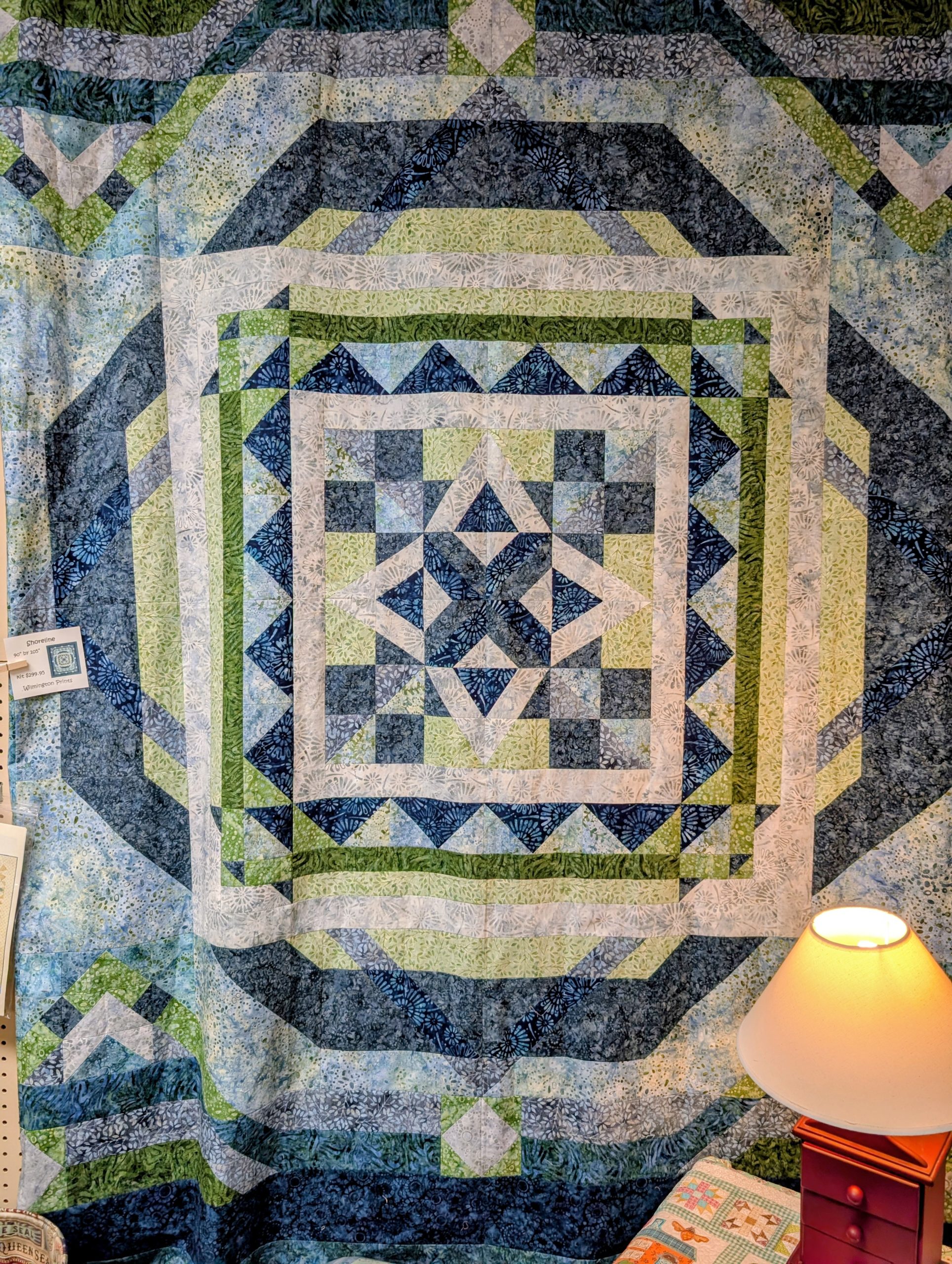 This gorgeous queen-sized quilt is made up of Wilmington batiks in blues and greens. Kit includes the pattern and all the fabric for the top and binding.