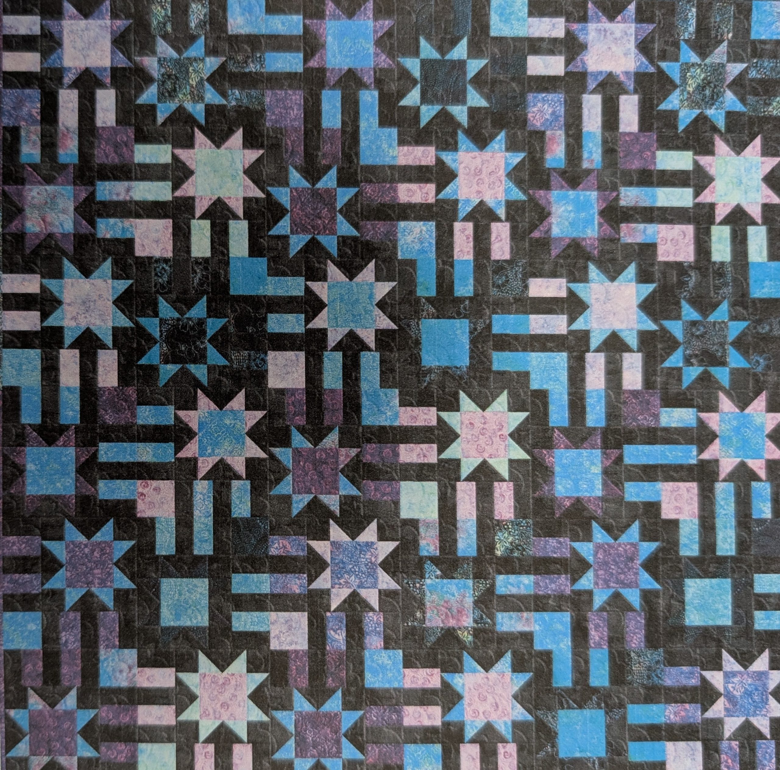 LAST CHANCE! There are only a couple kits left for this 84″ x 84″ Wilmington Starry Path quilt. Kit is made up in Moonshadow batiks from Wilmington.